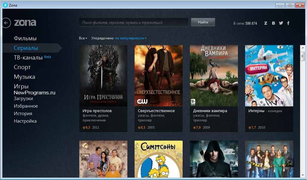 Zona — клиентское приложение для просмотра и загрузки контента в сетях BitTorrent. Объединяет в своём интерфейсе торрент-клиент (выполняющий функции, как и uTorrent 32 64 bit, Free Download Manager на русском) и торрент-трекер. В своей медиатеке содержит свыше 90 тыс. фильмов, 10 тыс. сериалов, 1000 игр, около 1 млн. часов разножанровой музыки. Поддерживает онлайн-транслирование 550 радиостанций, 150 телевизионных каналов, а также множество спортивных соревнований (футбол, хоккей, баскетбол, волейбол).