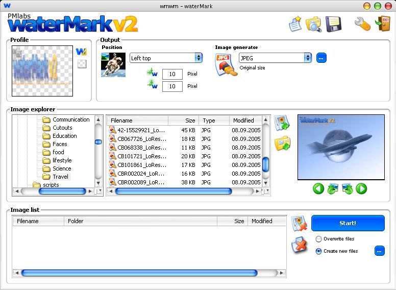 В Watermark предусмотрено добавление плагинов, выбор размера исходников и их переименование. Ещё здесь имеется функция предварительного просмотра, чтобы оценить результат ваших действий. В качестве водяного знака можно выбрать уже готовые шаблоны, а также добавить свой текст или несложную графику, применив к ним следующие манипуляции: