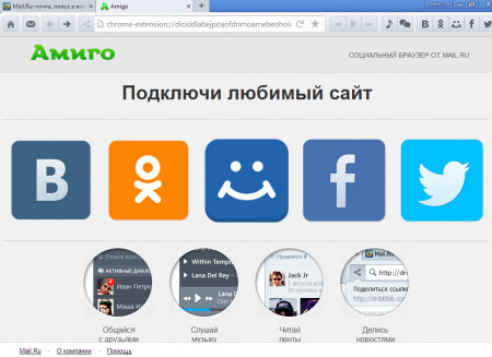 Обозреватель Амиго, разработанный Mail.Ru Group, предназначен для поиска совершенно любого информационного материала в интернете. Он ориентирован на пользователей известных социальных сетей (Мой мир, Вконтакте), после подключения которых, вы сможете через определённую панель получить к ним доступ и продолжить общение с друзьями, чтение постов и прослушивание музыки.