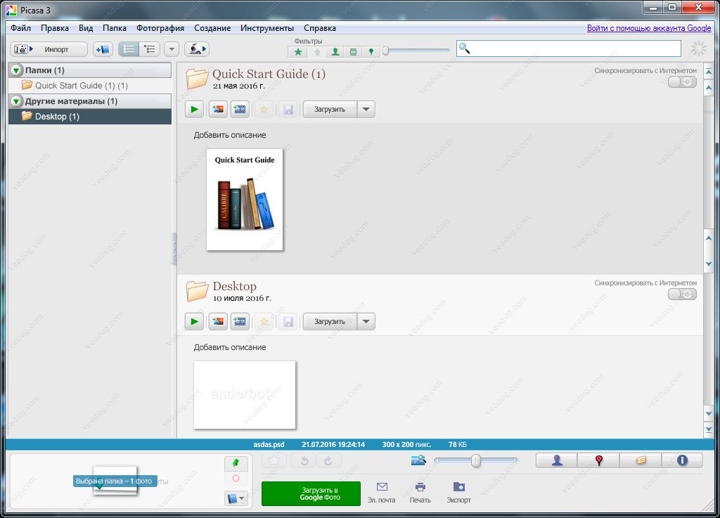 Picasa — приложение для управления подборками изображений и фотогалереями. Позволяет каталогизировать коллекцию, выполнять «поверхностную» правку фото и иллюстраций, подготавливать их к печати, «расшаривать» в Сети и выполнять множество других полезных операций. Программа выгодно отличается от стандартных графических редакторов типа Paint NET, Gimp на русском тем, что умеет под чутким руководством пользователя создавать красивые слайд-шоу, презентации и даже фильмы из фотоконтента, имеющегося в частной коллекции. При необходимости их можно отправить по почте или через соцсети отослатьдрузьям.