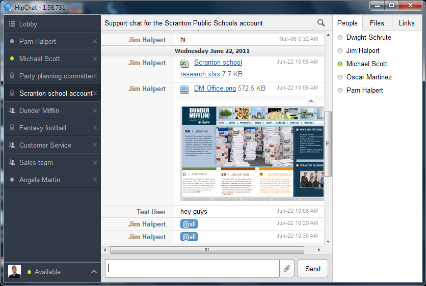 Приложение HipChat существенно отличается от других клиентов, поскольку создано специально для группового общения. Применение этого программного обеспечения будет удобным в крупных компаниях, когда для обсуждения важных вопросов нужно участи большого количестве человек, находящихся, к примеру, в разных странах. Также можно вести переговоры с конкурентами и отправлять им любые файлы.