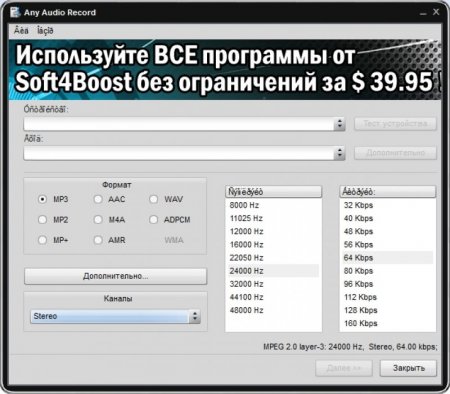 Удобная утилита Any Audio Record предназначена для захвата звуковых данных с самых разнообразных источников. К примеру, воспользовавшись ей, вы сможете включить необходимый видеоролик и фактически извлечь их него аудио или записать свой голос через микрофон. Софт гарантирует превосходное качество звучания без малейших искажений, что делает его лучшим среди конкурентов.