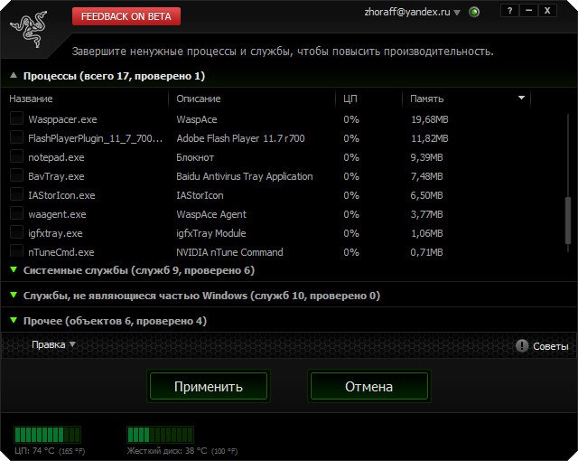 Продукт Razer Game Booster понадобится юзерам, которые используют старые компьютеры, где минимум оперативной памяти и установлен слабый процессор. Такие критерии способны повлиять на качество картинки современных видеоигр, потребляющих немало ресурсов. Программа отключает ряд процессов и некоторые службы, с целью повышения производительность OS.