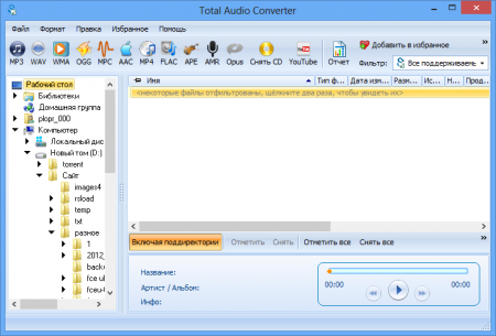 Если вы собираете собственную музыкальную коллекцию, но некоторые аудиофайлы требуют преобразования в определённый формат, то воспользуйтесь высококачественным и удобным в работе продуктом Total Audio Converter. Его интерфейс продуман идеально, что позволяет быстро освоиться даже неопытному юзеру. Конвертировать файлы можно на выбор в любой распространённый формат.
