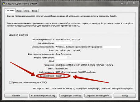- В новом окне можно увидеть исчерпывающую информацию о своем компьютере и его системных возможностях. В нижней части окна можно ознакомиться с установленной версией DirectX.