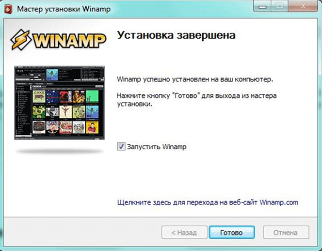 - Как только установка будет завершена, поставьте галочку напротив фразы «Запустить Winamp» и нажмите на кнопку «Готово».