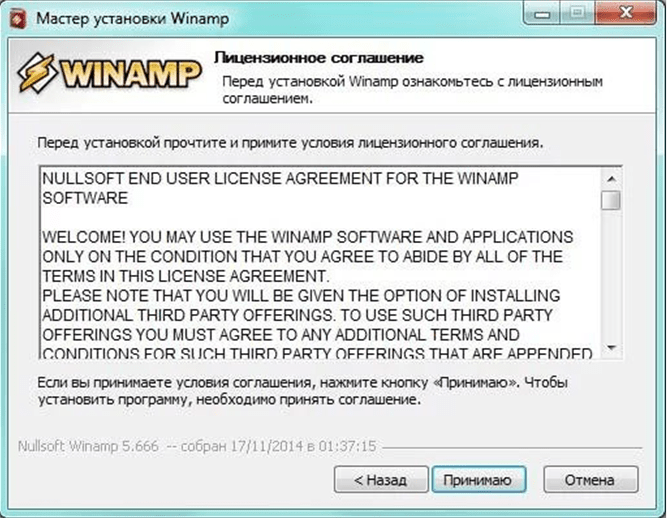 - После того, как откроется окно Установщика проигрывателя Winamp, внимательно читайте приведенную информацию. Только после прочтения нажимайте на кнопку, которая по периметру окрашена голубым цветом. Таким образом, вам предложат согласиться с условиями Лицензионного соглашения, выбрать оптимальный тип установки из имеющихся вариантов, а также следует отметить галочкой, если нужны ярлыки на рабочем столе или в меню быстрого доступа.