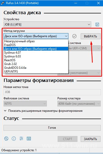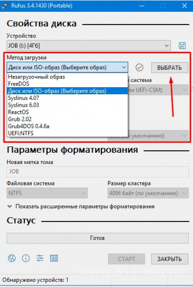 - В пункте «Метод загрузки» выберите подходящий образ операционки из выпадающего списка и нажмите на «Выбрать».