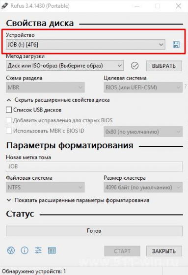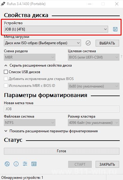 - Для создания флэшки с образом популярной платформы следует запустить Rufus. После открытия окна утилиты «Свойства диска» кликните на нужное устройство. Это следует делать в том случае, если к ПК подключен не один, а сразу несколько носителей.