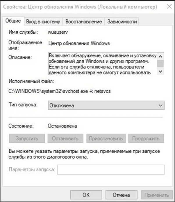 - В новом окне нажмите на кнопку «Остановить» и в строке «Тип запуска» выберите вариант «Отключена».