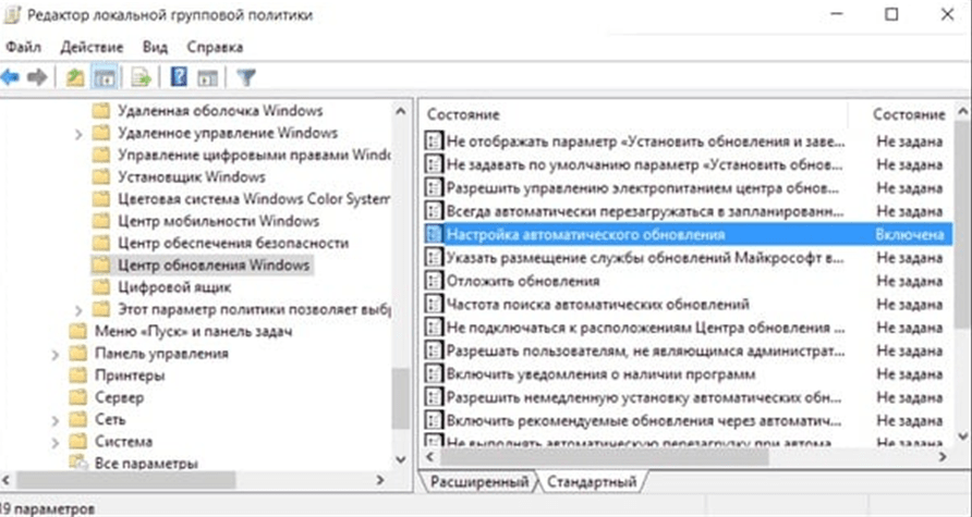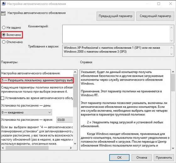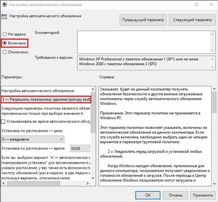 - Когда откроется новое окно, выберите вариант «Включено», а в разделе «Параметры» нужен 5-й по счету пункт, который позволяет админу выбирать осуществлять корректировку параметров. С этого момента будет действовать ограничение на автоматическую установку обновлений.
