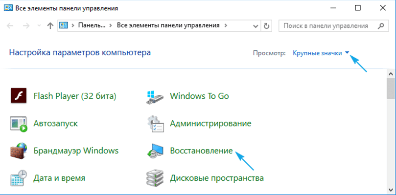 - Откройте Панель управления и в разделе «Настройка параметров компьютера» рядом с полем «Просмотр» выберите пункт «Крупные значки». Среди многочисленных параметров нажмите на вариант «Восстановление».