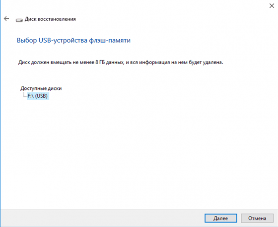 - Подключите съемный носитель к компьютеру, выберите свое USB-устройство из списка и переходите к следующему действию, нажав на кнопку «Далее».