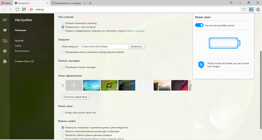 Утилита Opera, которую можно скачать для Windows 10 с официального сайта разработчика по этой ссылке https://www.opera.com/ru, может сэкономить заряд батареи, если вы пользуетесь ею со смартфона, планшета или ноутбука. Например, если в настройках вы заранее включите этот режим, то при отключении устройства от зарядки автоматически включится энергосбережение. Данная опция включается и отключается вручную в настройках при помощи специального ползунка.