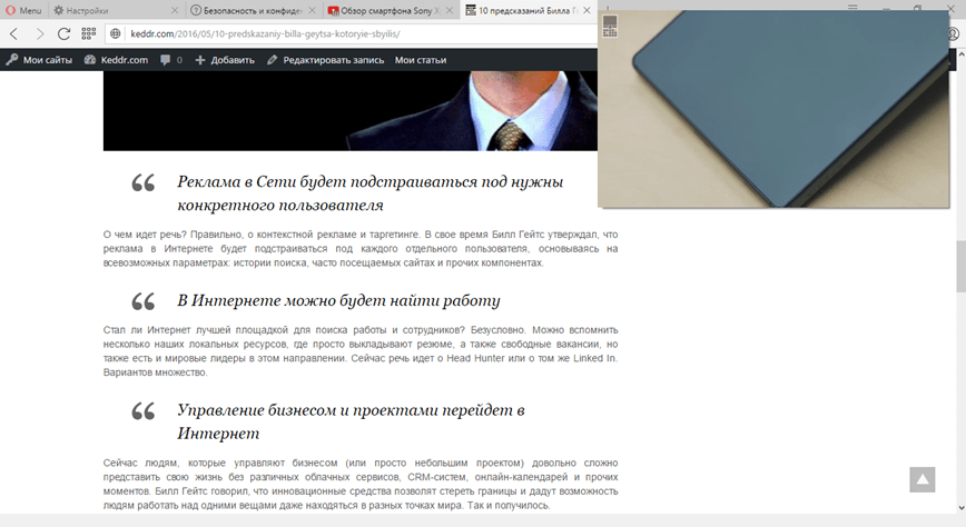 Если вы просматриваете видеоролики в сети Интернет на регулярной основе, то данный плеер точно пригодится. Это нововведение также отличается простым принципом работы. При просмотре выбранного ролика появляется выпадающий значок. Если кликнуть на него, то ролик трансформируется в отдельное окно, которое потом можно будет перемещать по экрану. Напоминаем о том, что такая новинка доступна для тех, кому уже удалось загрузить браузер Opera бесплатно для Windows 10.
