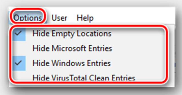- Кликайте на «Options» и ставьте галочки напротив 2 выбранных вариантов из списка - Hide Empty Locations и Hide Windows Entries. Первый скрывает пустые параметры, а второй скрывает очень важные параметры, которые не рекомендуется менять, чтобы не навредить операционке.