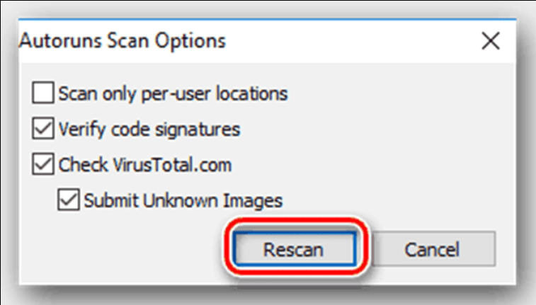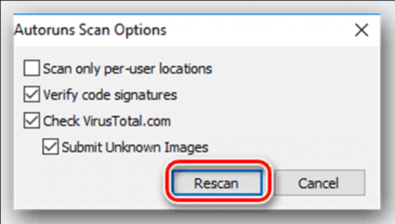 - Выставьте галочки напротив выбранных пунктов и нажмите на «Rescan».