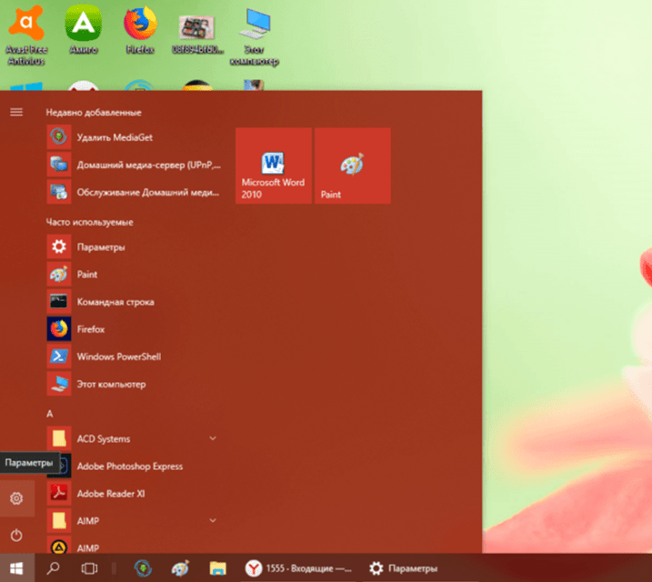 - Нажмите "Win+I", чтобы открылось окно под названием "Параметры". Альтернативный способ - меню "Пуск", с левой стороны находится шестеренка, изображенная на картинке. Кликните на эту шестеренку, чтобы перейти к следующему действию.