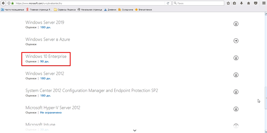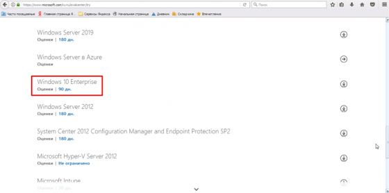 - Среди обширного списка цифровых продуктов найдите операционку Windows 10 Enterprise, которая будет доступна в течение 90 дней, и нажмите на нее.