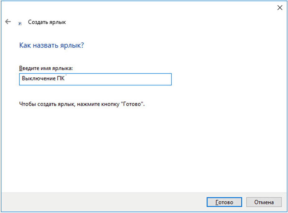 - Когда появится другое окно, наберите имя ярлыка, а потом нажмите на «Готово». В этом случае на Рабочем столе появится новый ярлык, с помощью которого можно будет отключить собственный ПК.