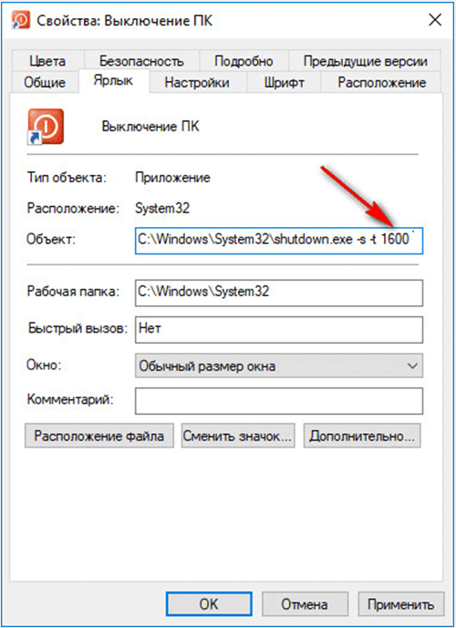 - В этом окне откройте вкладку «Ярлык» и обратите внимание на пункт «Объект». Измените время в секундах и подтвердите свое действие нажатием на кнопку ОК.