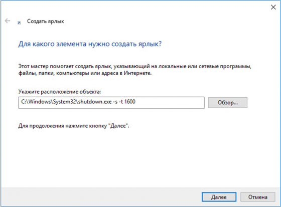 - В новом окне под названием «Создать ярлык» введите точный путь до искомого объекта. Например, «C:\Windows\System32\shutdown.exe -s -t X», Х - секунды, как в предыдущих методах. Не забывайте нажимать «Далее».