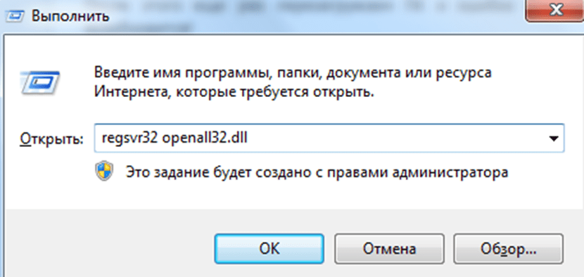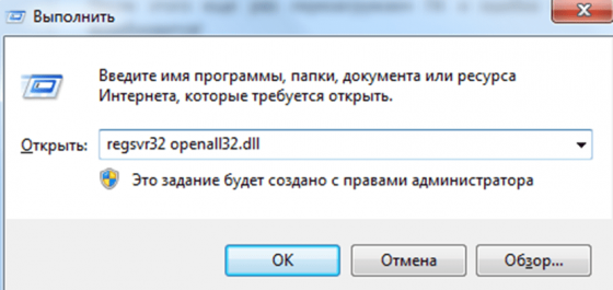 - Зайдите в обработчик команд: «Пуск» — «Выполнить» и напишите regsvr32 + имя файла.