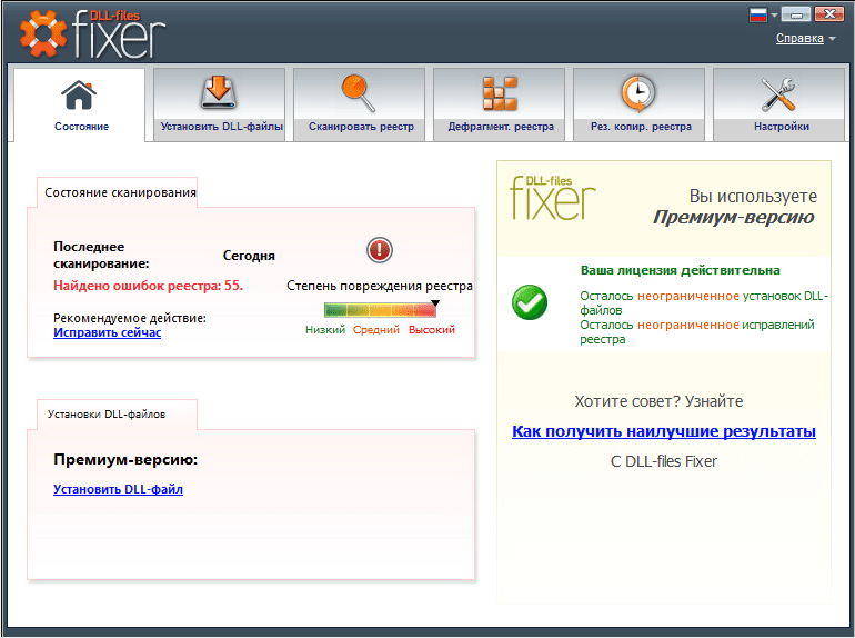 Программа на русском языке, отличается информативностью и хорошей оптимизацией. Она может проверять целостность структуры DLL и реестра. Все проблемы устраняются в автоматическом режиме, пользователю нужно лишь выбрать одну из доступных операций.