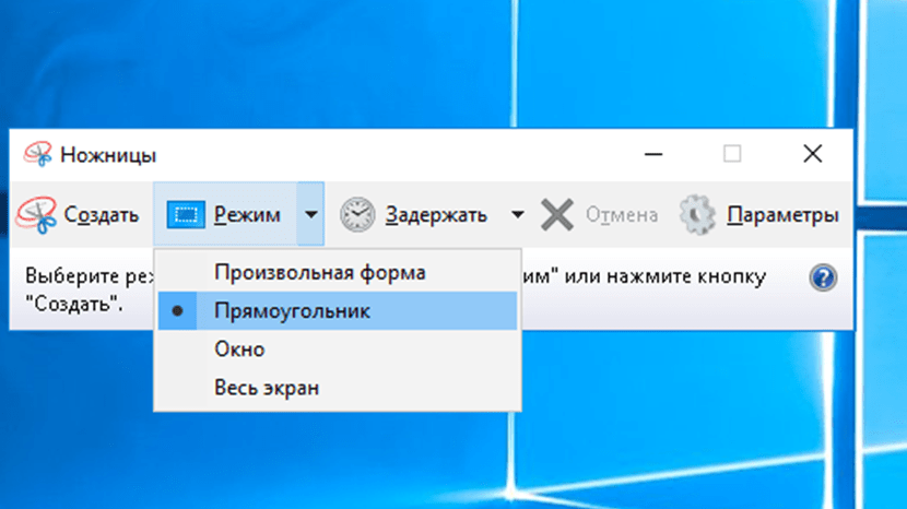 После установки зайдите в меню «Пуск», откройте список приложений и найдите там «Ножницы». Запустится маленькое окно с 4 вкладками: «Создать», «Задержать», «Отмена» и «Параметры». Принцип работы прост — выберите первый вариант и отметьте область. Далее появится кнопка сохранения, можно выбрать путь и подходящий формат конечного документа.