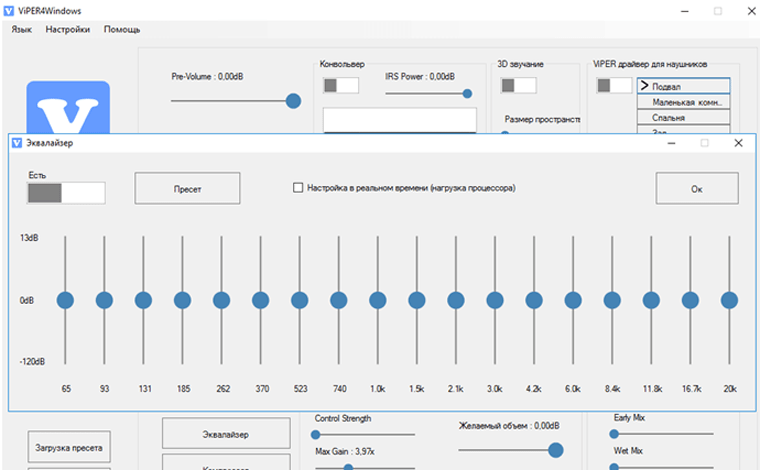 Настроек в утилите намного больше, чем в предыдущем варианте. Если вы захотите скачать эквалайзер на компьютер, то будьте готовы вникнуть в особенности управления функционалом. Присутствует русский язык, выбрать перевод можно в первой вкладке. Из главных особенностей стоит выделить объемное звучание, режим кино и технологию исправления звуковой дорожки.