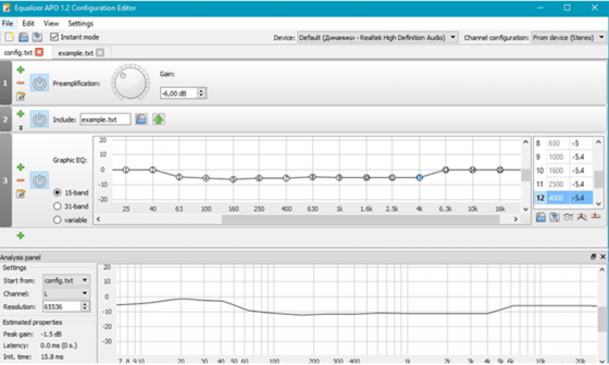 Пожалуй, один из самых продвинутых редакторов звука. Программа не нагружает процессор, предоставляет максимум возможностей для тонкой настройки уровней. Русский язык не поддерживается. Утилита анализирует список подключенных устройств и позволяет настраивать любое из них. Этот эквалайзер для windows 10 обеспечивает управление через переключатели и ползунки. Параметры отображаются как точки на графиках. Результат конфигурации сохраняется в отдельный файл, который впоследствии можно отредактировать или отправить другому пользователю. Особенно порадует любителей слушать качественную музыку встроенный архив фильтров и звуковых эффектов.