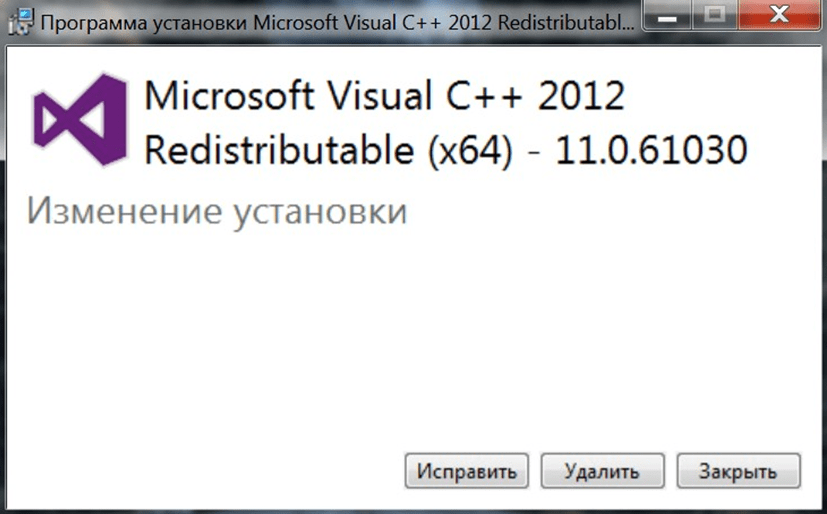 Нужный нам DLL входит в состав библиотеки Visual Studio 2012. Если она уже установлена на компьютере, то можно попробовать восстановить работоспособность через «Панель удаления/изменения программ» или удалить программное обеспечение с компьютера и переустановить его.