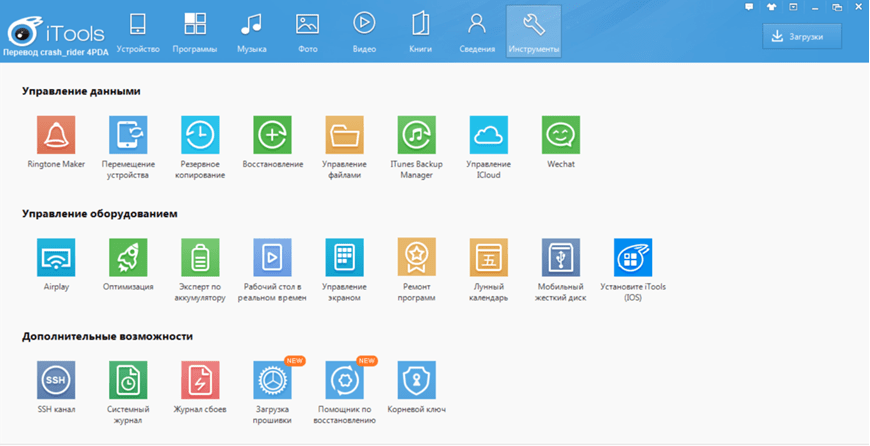 Для обмена мультимедийным контентом есть программа iTunes, но она отличается сложным интерфейсом и часто пользователи жалуются, что без Интернета загрузить фильм или новую музыку на гаджет не получается. Для решения этой задачи можно скачать iTools на русском и воспользоваться функционалом софта. Он является аналогом стандартного Айтюнс, но при этом загружает файлы на планшеты или телефоны без подключения к сети.