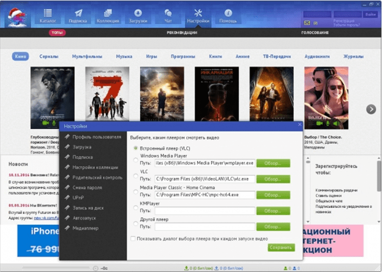 Структура вкладок чем-то напоминает MediaGet — контент разделен на кино, сериалы, музыку, книги, игры, программы, телевизионные трансляции и т.д. Стоит отметить глубокую проработку фильтров. К примеру, можно отсортировать фильмы по жанру или посмотреть самые рейтинговые загрузки.