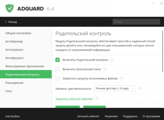 - Родительский контроль. Пожалуй, одна из самых полезных функций. С помощью инструментов можно блокировать установку новых программ и запрещать открытие сайтов, которые могут повлиять на детскую психику. В настройках есть уровень чувствительности, который запрограммирован на определенный возраст. Обязательно стоит обратить внимание на защиту паролем.