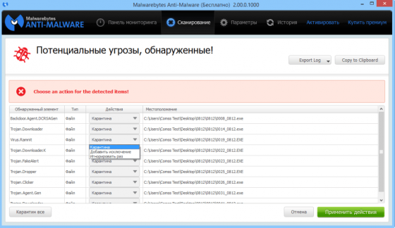 При обнаружении заражённого файла программой Malwarebytes Anti-Malware пользователю будет предложено три варианта дальнейших действий, среди которых: отправить в карантин, игнорировать либо добавить в исключение.