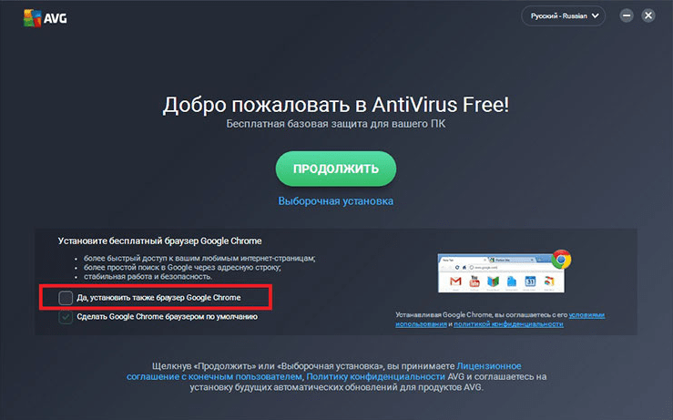 Google Chrome». Можете этого не делать, и тогда на ваш ПК будет инсталлирован данный браузер. Затем кликаем на «Выборочная установка».