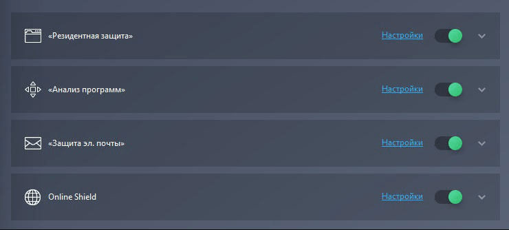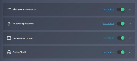 Антивирус состоит из четырёх компонентов, которые и отвечают за защиту персонального компьютера. Рассмотрим каждый из них в отдельности:
