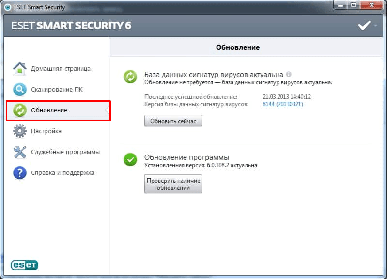- Обновление – раздел для проверки или запуска обновлений базы данных сигнатур вирусных атак. Также в этой вкладке можно проверить наличие новой версии программы.