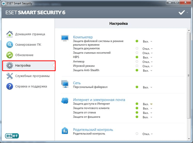 - Настройка – вкладка используется для отключения или включения разных модулей антивируса.