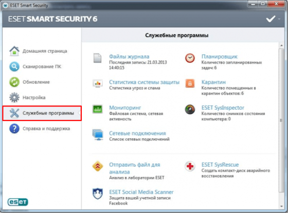 - Служебные программы – этот раздел предназначен для запуска программ, таких как «Сетевые подключения», «Мониторинг», «Планировщик», «Статистика системы защиты, «Карантин» и других.