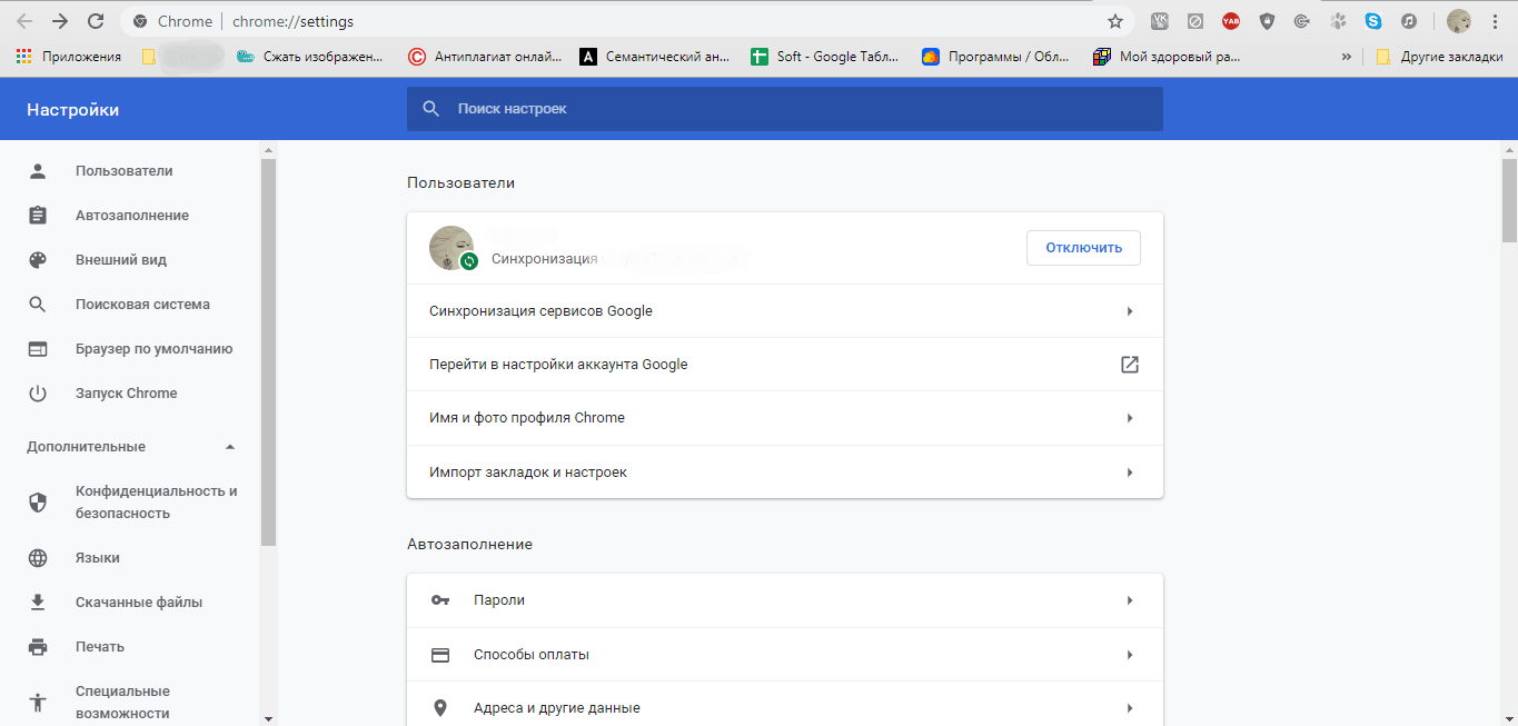 - Настройки – перейти в настройки браузера можно через главное меню, расположенное вверху справа. Выбираем раздел «Настройки». В открывшейся вкладке будет доступен перечень разных настроек, где можно отключить или включить синхронизацию, установить фото профиля, импортировать закладки, управлять паролями, настроить размер шрифта, установить поисковую систему, очистить историю и многое другое.