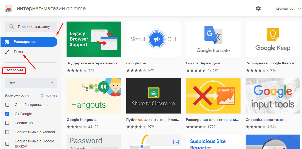 - Расширения – web-просмотрщик предусматривает установку специальных расширений, ознакомиться с которыми можно в магазине Google. Расширения рассортированы по разным категориям, например: погода, развлечение социальные сети, спорт, блоги, новости, инструменты разработчика и другие. Расширения облегчают работу в браузере и являются довольно удобными, к примеру есть возможность добавить калькулятор, прогноз погоды, заметки и т.д. Также в этом магазине можно выбрать и установить тему для браузера.