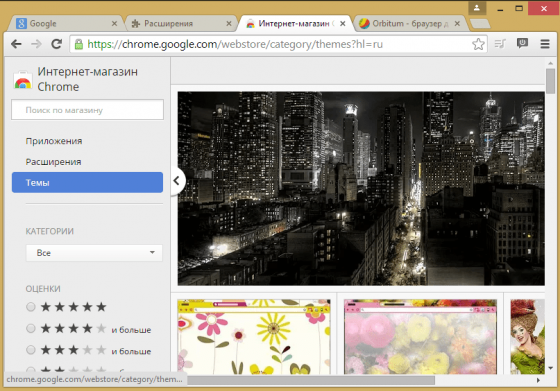 Интерфейс, меню и принцип управления закладками в браузере Orbitum такой же, как и у просмотрщика Гугл Хром, поэтому большинство пользователей смогут легко его настроить и приступить к работе. Здесь также можно устанавливать разные темы для оформления программы и полезные расширения, например погода, календарь, переводчик, блокировщик рекламы и другие – для этого необходимо зайти в интернет магазин Google.