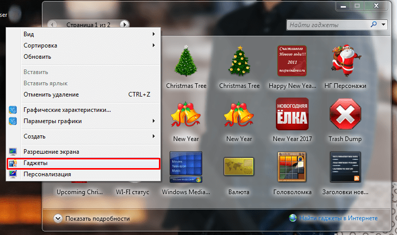 - На экране рабочее стола кликните правой кнопкой мыши и выберите из списка пункт под названием «Гаджеты».