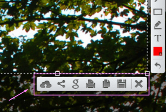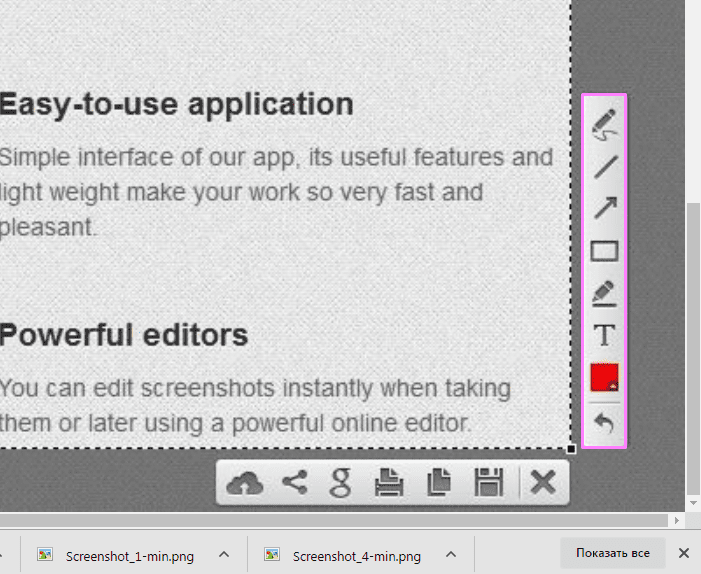 Итак, когда вы хотите сделать скрин и нажимаете для этого соответствующую кнопку, то экран темнеет, после чего вам понадобится выделить желаемую область. Можно сразу сохранить снимок либо преобразовать его с помощью специальных инструментов, которые располагаются на специальной панели, выделенной на фото ниже розовым цветом: