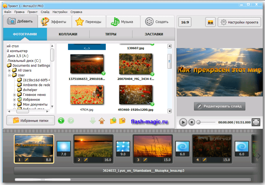 ФотоШОУ PRO представляет собой простую, но довольно качественную утилиту для создания красивых и оригинальных слайд-шоу из любых картинок или фотографий (свадебных, детских, новогодних или просто повседневных, к примеру из социальных сетей). Слайд-шоу может стать отличным подарком для близких и родных людей. Благодаря этой программе вы получаете возможность подготавливать интересные тематические видеоролики, используя готовые шаблоны или создавая полностью всё с нуля. Работать в приложении очень легко, кроме того по своему функционалу оно напоминает известную каждому программу Windows Movie Maker.