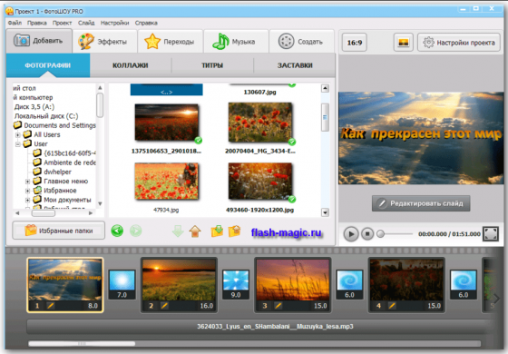 В программе ФотоШОУ PRO пользователи получают возможность объединить видео, фотографии и музыкальные композиции, что даёт возможность создать по-настоящему качественное и интересное слайд-шоу. Максимально удобный интерфейс, простое управление и большое количеств инструментов, это далеко не все преимущества программного обеспечения, на самом деле их насчитывается довольно много: