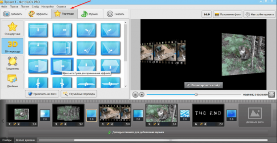 - Использование оригинальных переходов (стандартные, 3D переходы, градиенты и другие).