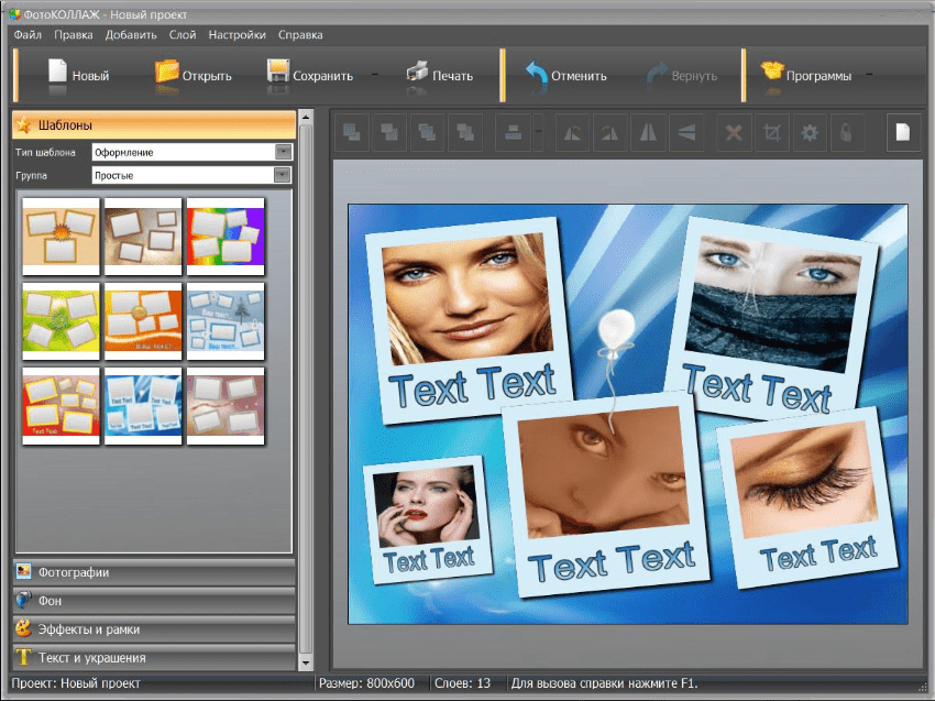 ФотоКОЛЛАЖ – это программа для создания красивых коллажей из фотографий и изображений любой тематики, например можно взять свадебные фото или новогодние картинки. С помощью утилиты можно создавать поздравительные открытки, рекламные листовки или приглашения. Приложение элементарно в плане управления, пользоваться им проще простого, следовательно, оно рассчитано на новичков, которые пока ещё не научились работать в более продвинутых редакторах, таких как Krita или Paint.NET.